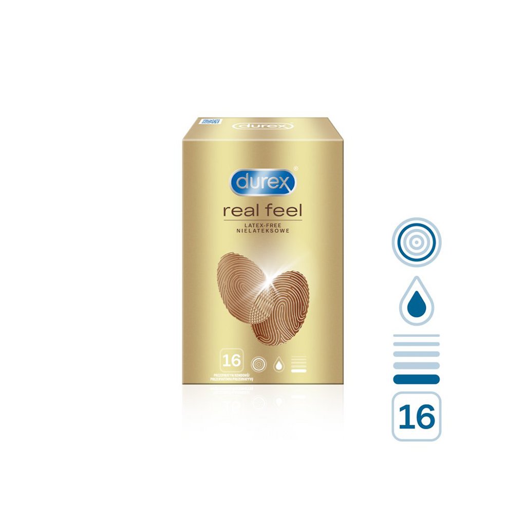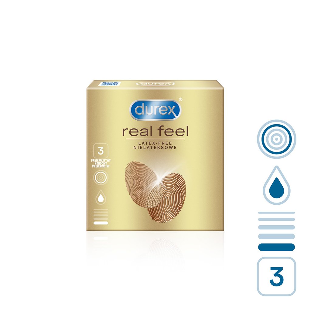 Kondomy Durex Real Feel jsou průhledné lubrikované kondomy zakončené rezervoárem. Jsou vyrobeny z technologicky vyspělého nelatexového materiálu. Klinicky ověřeno.