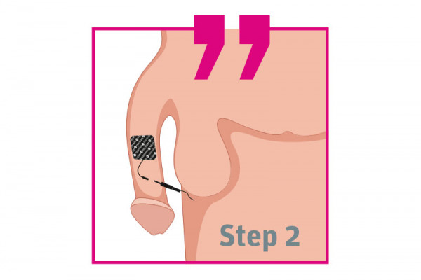 Druhý krok: Z každé strany penisu aplikujte jednu adhezivní elektrodu. Tento krok denně střídejte s prvním krokem po dobu 30 minut.