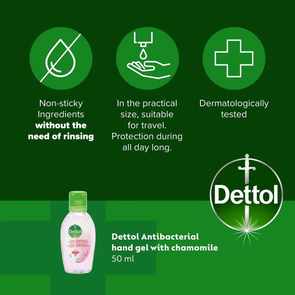 Dettol antibakteriální gel na ruce s heřmánkem ničí 99,9 % bakterií a virů bez použití vody. Biocidní účinek do 60 sekund. Praktický pro rychlou dezinfekci rukou na cestách i doma.