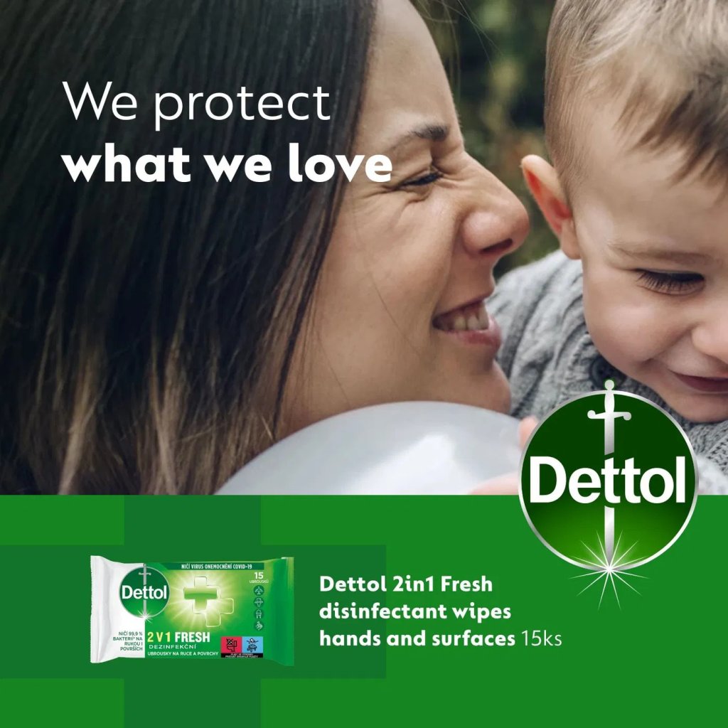 Dettol dezinfekční ubrousky 2v1 ničí 99,9 % bakterií na rukou i površích. Rychlé a praktické řešení pro okamžité použití doma i na cestách. Se svěží vůní, bez silného dezinfekčního zápachu.