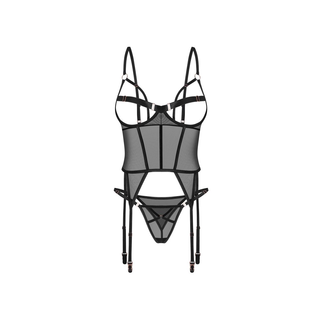 Pokud vás přitahuje spojení čistých linií a promyšlených detailů, korzet Euridia vás okouzlí. Průsvitná černá tkanina se dokonale doplňuje s kovovými prvky a efektními ramínky, které vytvářejí moderní a smyslný vzhled.