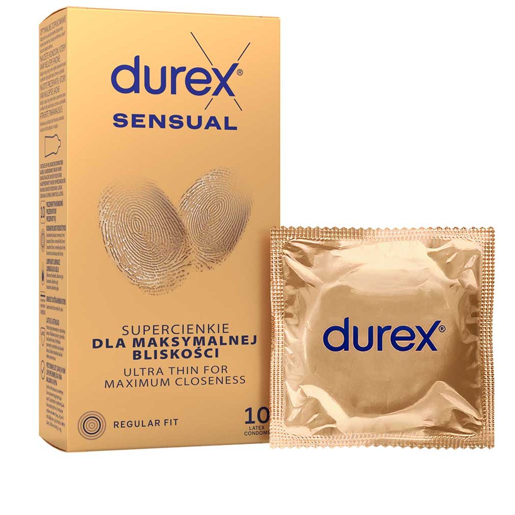Kondomy Durex Sensual v běžné (standardní) velikosti. Jsou extra tenké, lubrikované silikonovým gelem a mají anatomický tvar pro snadnější nasazení a ještě intenzivnější prožitek.