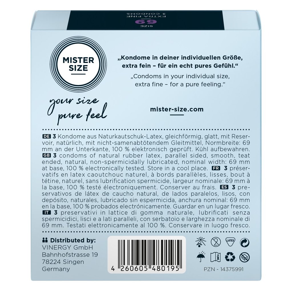 S kondomy Mister Size si každý muž najde ten pravý kondom, který mu perfektně sedí a neklouže. Díky tomu že kondom je ultra tenký, úplně zapomenete, že ho máte nasazený. Kondomy jsou veganské.