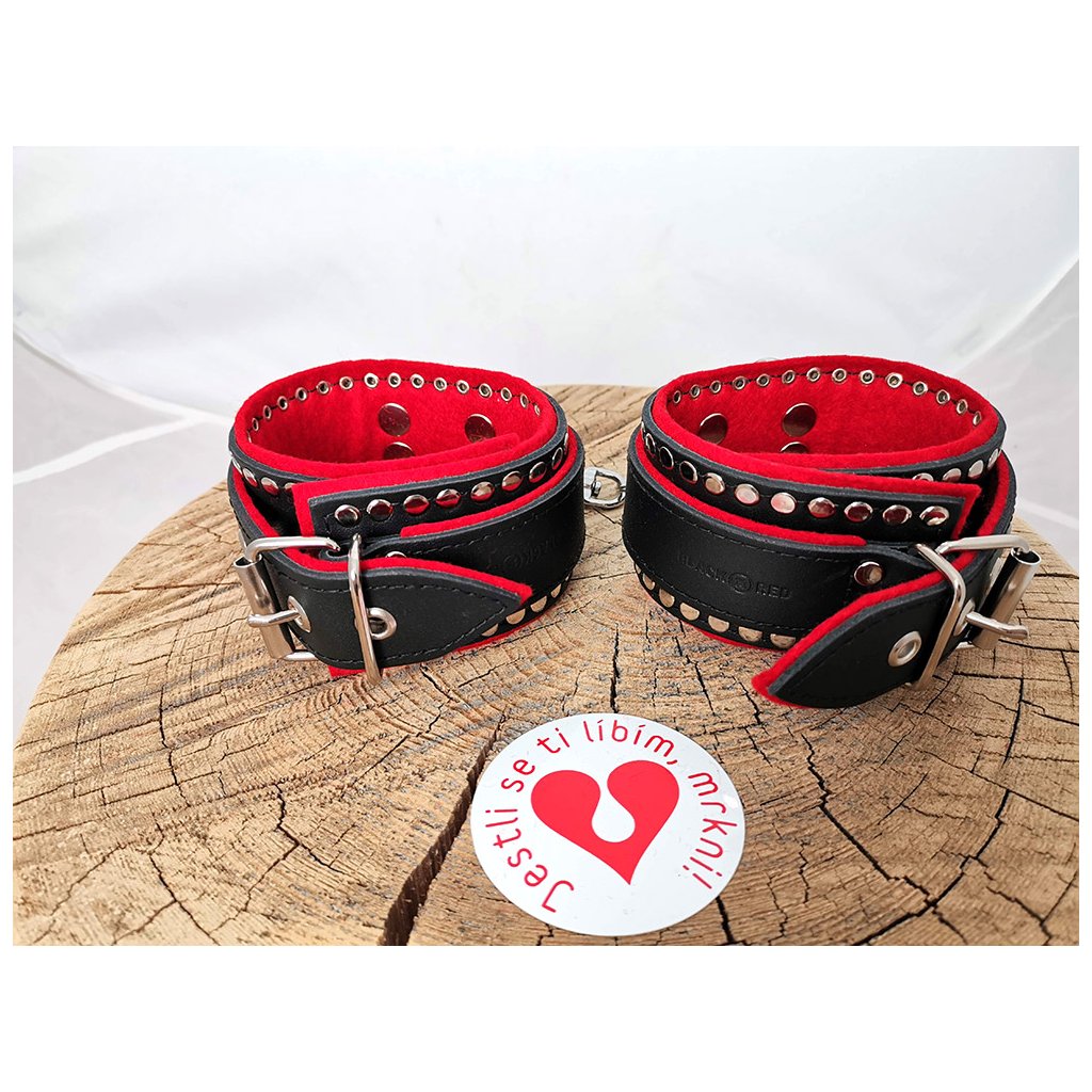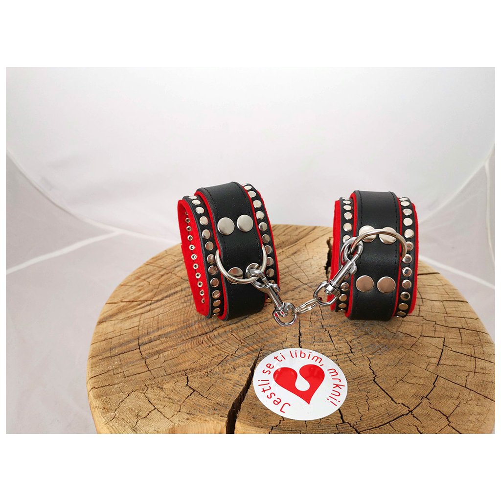Pouta na nohy z kvalitní pravé kůže jsou polstrovaná s nastavitelnou velikostí zapnutí, spojena jsou dvěma karabinkami na D kroužcích. Pouta jsou zdobena stříbrnými nýty.