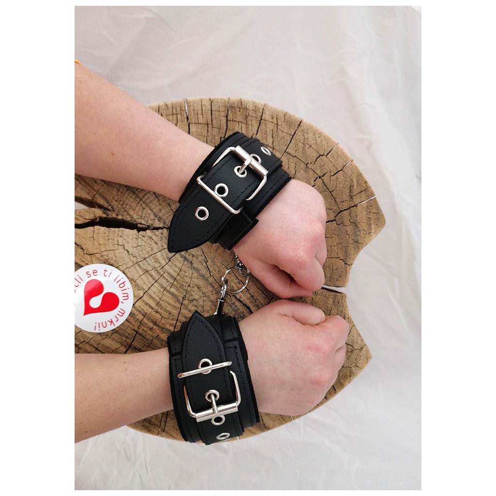 Pouta na ruce z kvalitní pravé kůže jsou polstrovaná s nastavitelnou velikostí zapnutí, spojena jsou dvěma karabinkami na D kroužcích. Široká plocha pout roznese tlak, takže jejich nošení není nepříjemné ani nijak nebolí.