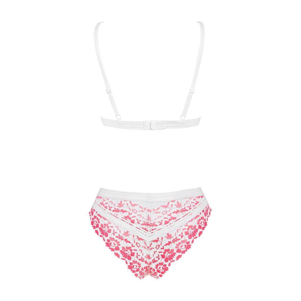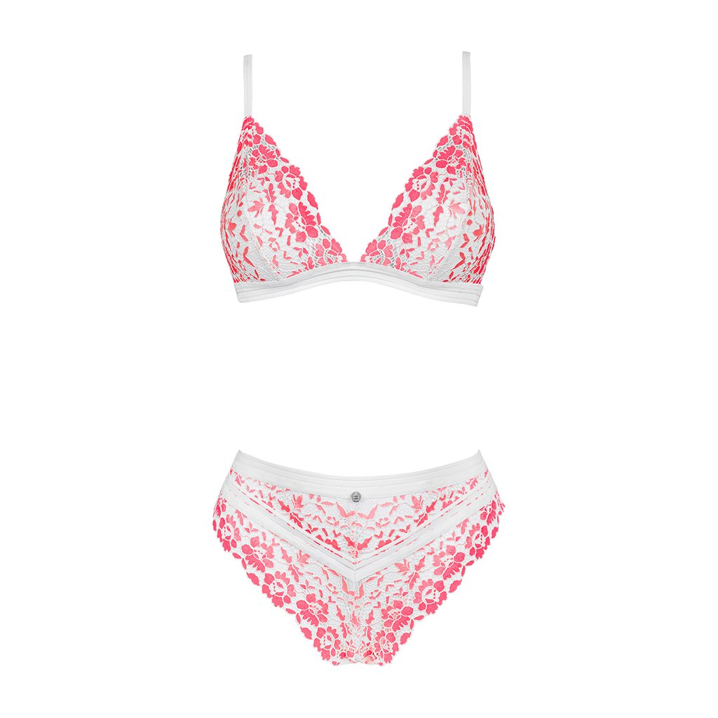 Dámský set v odstínu světle růžové 🌸 Krajka s květinovým vzorem dokonale ozdobí vaše tělo a dodá na eleganci. Trojúhelníkové, měkké košíčky podprsenky jsou ideální pro velká i malá prsa 🍒. Nastavitelná ramínka a zapínání na zádech umožní dokonalé přizpůsobení podprsenky tvaru těla.