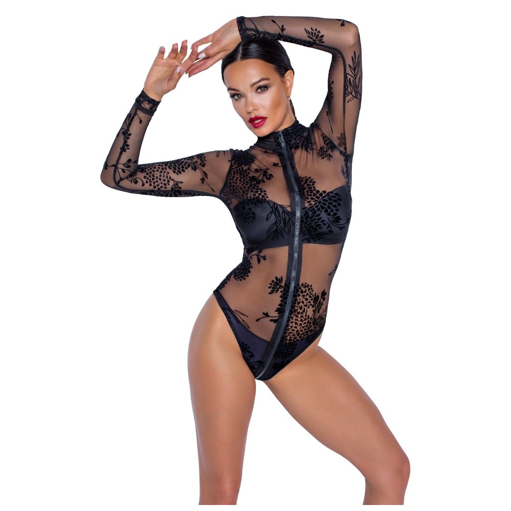 Exkluzivní body s dlouhým rukávem vyrobené z elastické materiálu s jemným sametovým potiskem v květinovém designu. Praktický 3cestný zip vpředu od stojáčku až dolu dolů k rozkroku.