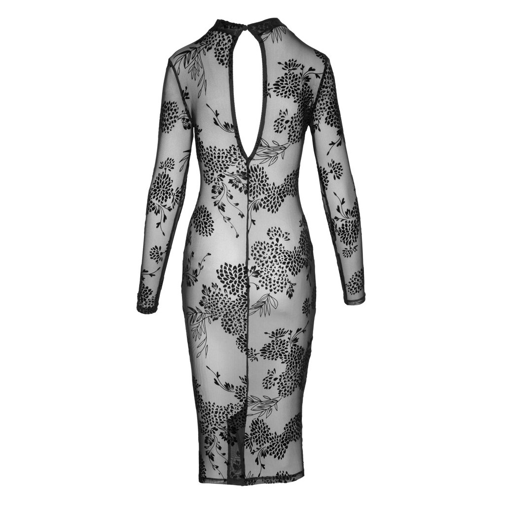 Exkluzivní šaty s dlouhým rukávem ušité z elastického materiálu s jemným sametovým potiskem v květinovém designu. Vzadu mají šaty cca 18 cm dlouhý rozparek. Stojáček se zapíná na malý knoflík u krku. Tanga ani podprsenka nejsou součástí balení.