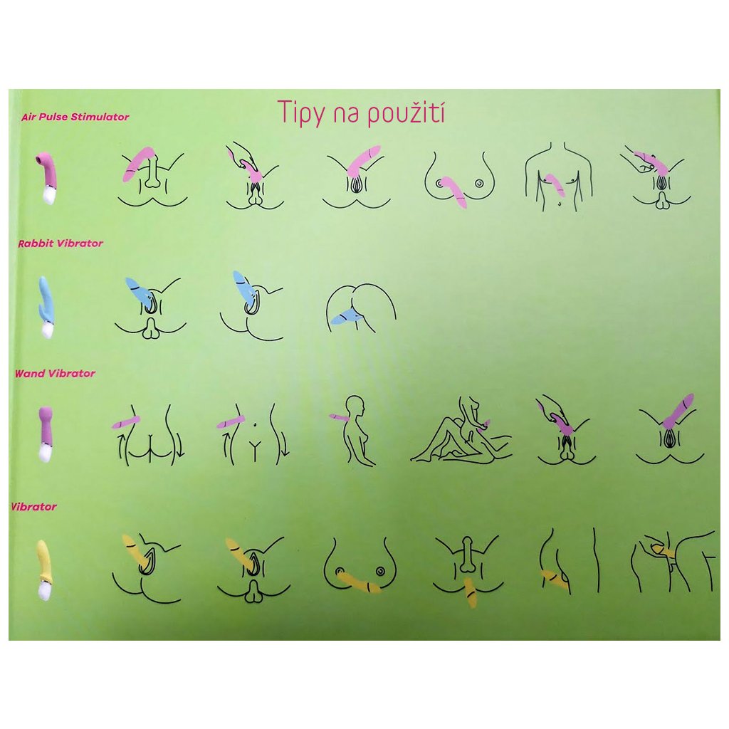 Podtlakový stimulátor je perfektní volbou pro bezdotykovou stimulaci klitorisu. Rabbit vibrátor je dokonale stimuluje váš G bod a současně klitoris. Masážní hlavici můžete použít na masáže celého těla i erotogenních zón jako je klitoris, bradavky, penis apod. Klasický vibrátor je skvělý pro vaginální i anální stimulace.