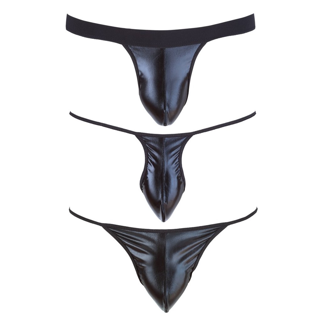 Sada obsahuje troje tanga ve třech různých stylech. Všechny tři jsou v černém elastickém provedení se silným leskem. Mají pružné pasy a jsou pohodlné na nošení.