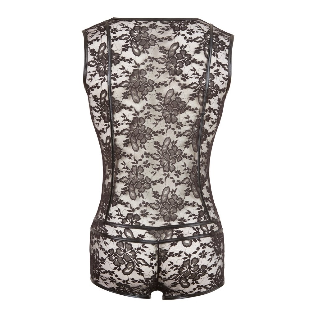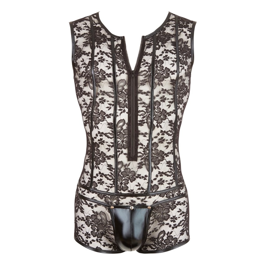 Černé pánské krajkové body je vyrobené z elastické květinového materiálu s lyskými proužky mokrého vzhledu. Z přední strany na zip. Díky kapse v rozkroku lze vytvořit dojem většího mužství tím, že penis a varlata zastrčíte do pouzdra přes vnitřní protahovací otvor. Kapsa v rozkroku může být odepnuta.