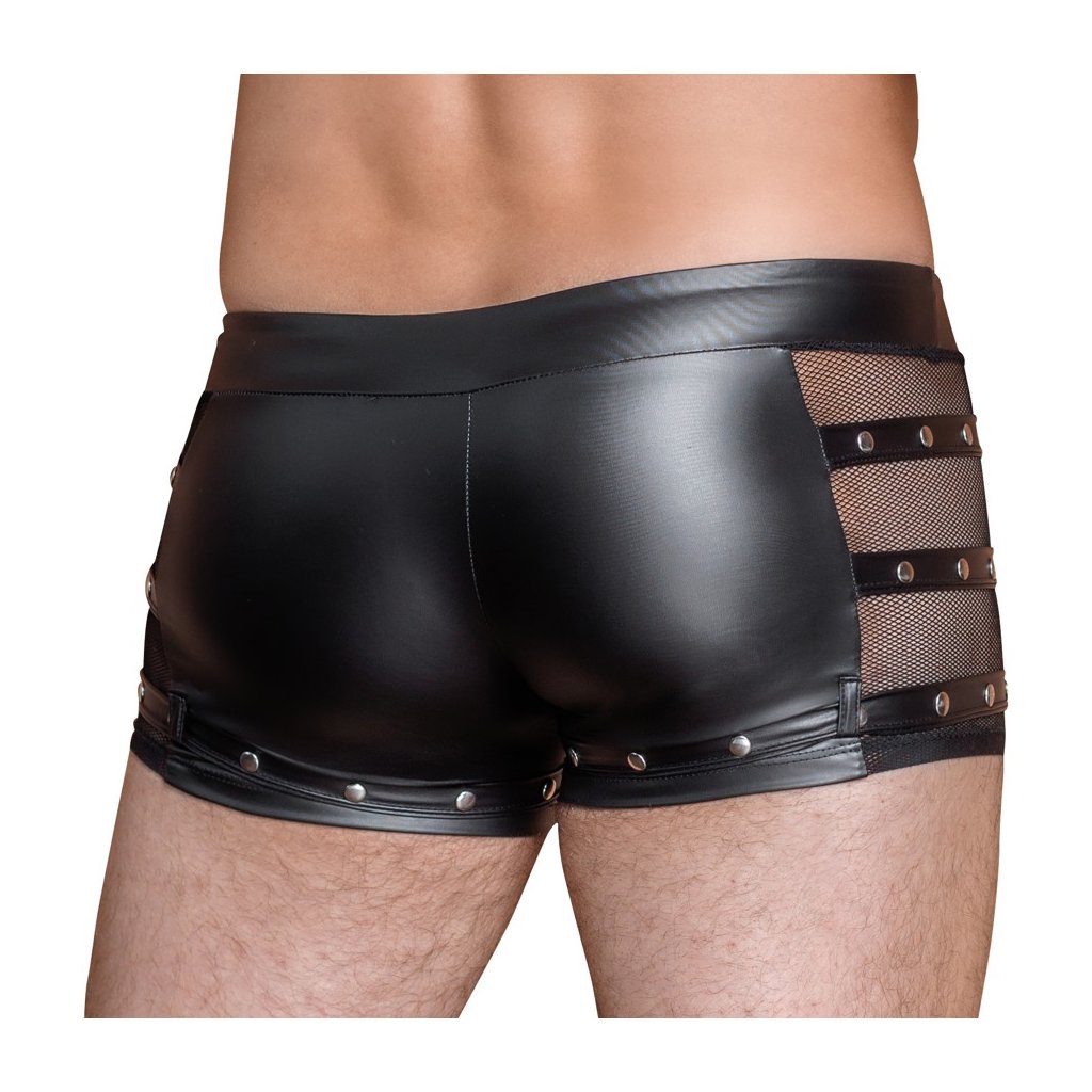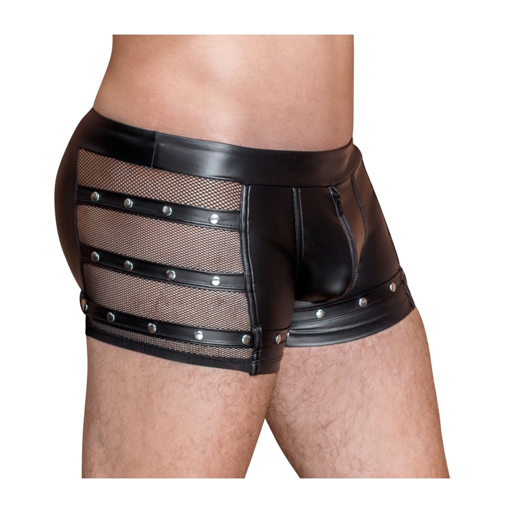 Černé pánské boxerky zvýrazňujícího matného vzhledu s předním zipem, který lze rozepnout. Na každé straně jsou síťované vsadky s pásky zdobenými cvočky.
