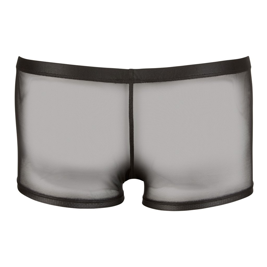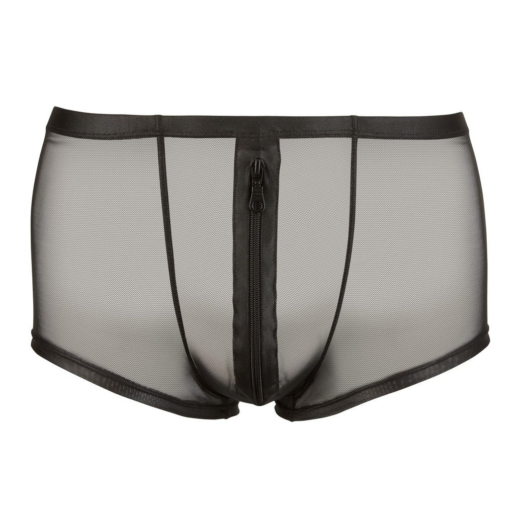 Černé boxerky Svenjoyment ušité z mírně lesklé průhledné tkaniny. Se zipem na přední straně.