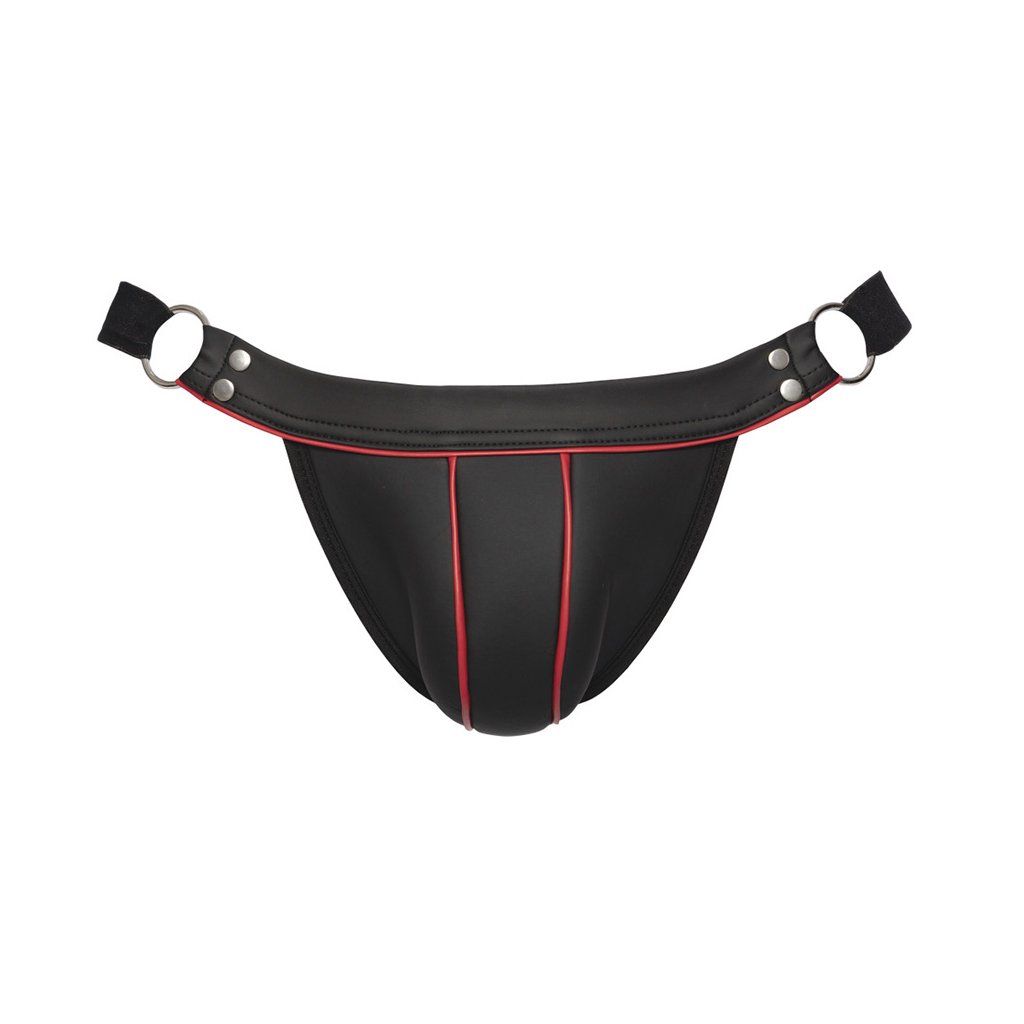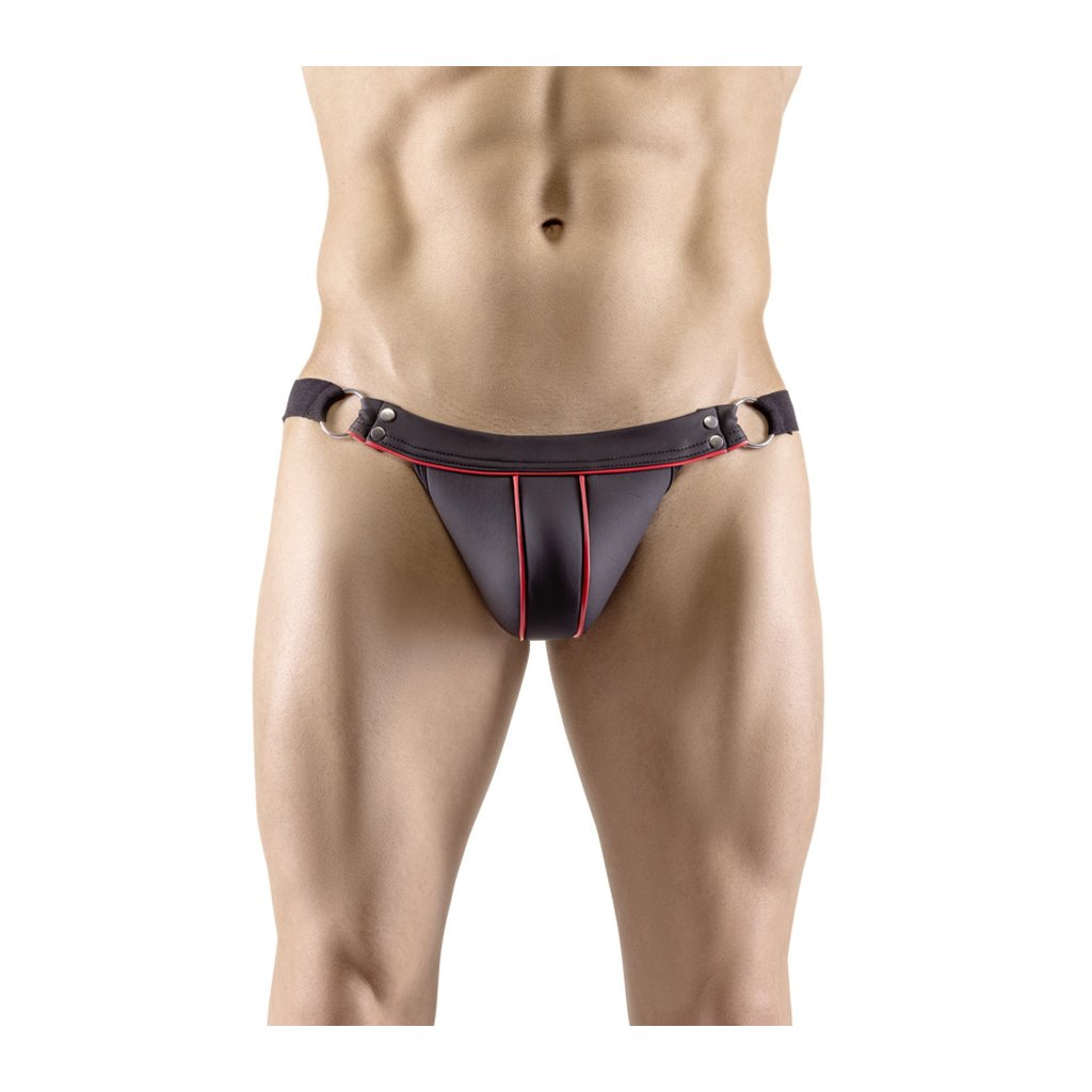 Erotické slipy v nápadném neoprenovém vzhledu s červeným lemováním. Dokonalý střih s širokými páskami dokonale odhalí a zvýrazní váš zadeček. Díky elastickému materiálu se navíc můžete spolehnout na maximální volnost pohybu a maximální pohodlí při nošení.