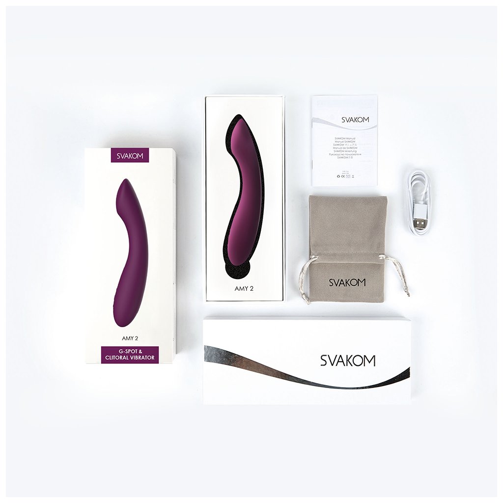 Vibrátor Svakom Amy 2 jednoduchého elegantního designu se zahnutou špičkou jemně opisuje Vaše křivky a poskytuje vhodné potěšení pro stimulaci G-bodu nebo okolo klitorisu.