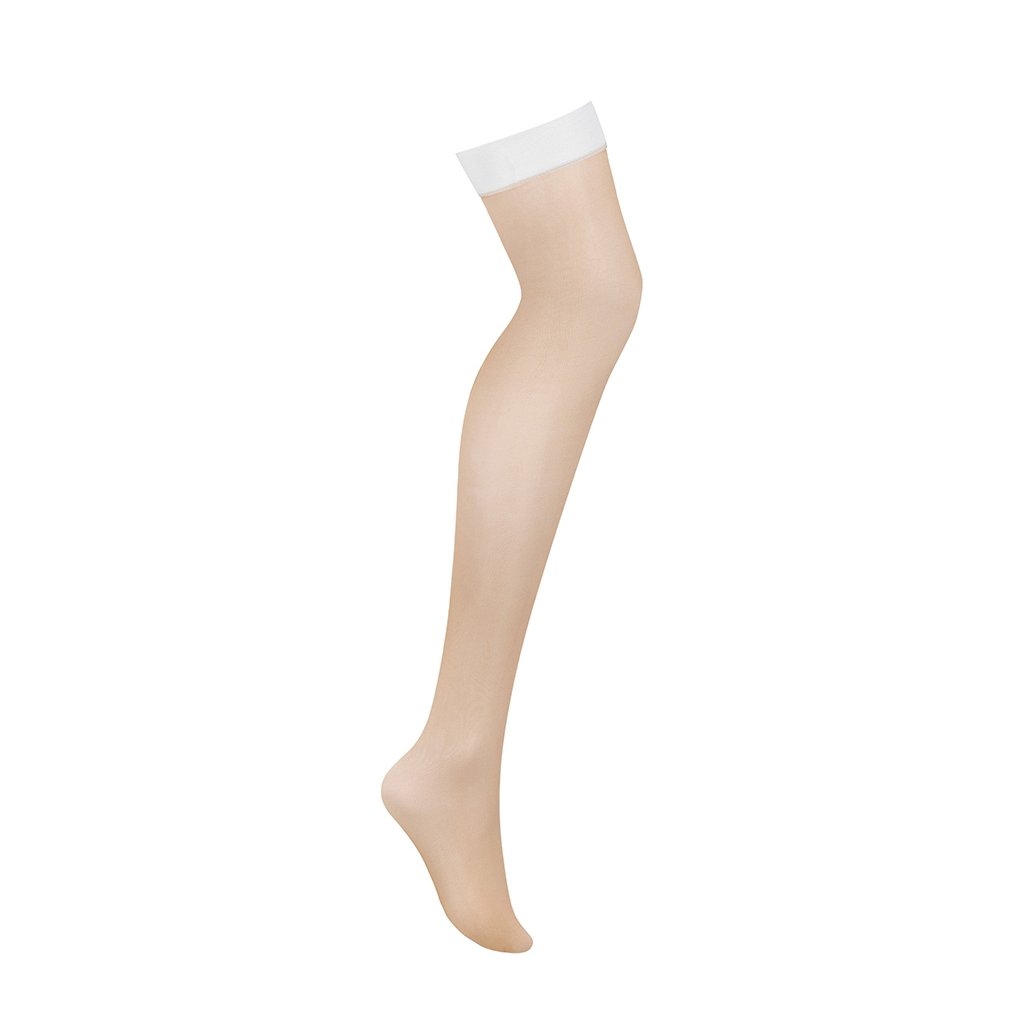 Podvazkové punčochy, který dokonale zvýrazní nohy. Spolu s ladícím podvazkovým pásem vytvoříte komplet plný sex-appealu! Model S814 s jemnou bílou úpravou bude například perfektní jako doplněk k svatebním šatům 👰. Béžová síťovina krásně padne na tělo a bílá hladká úprava smyslně zdůrazňuje stehna 🦵.