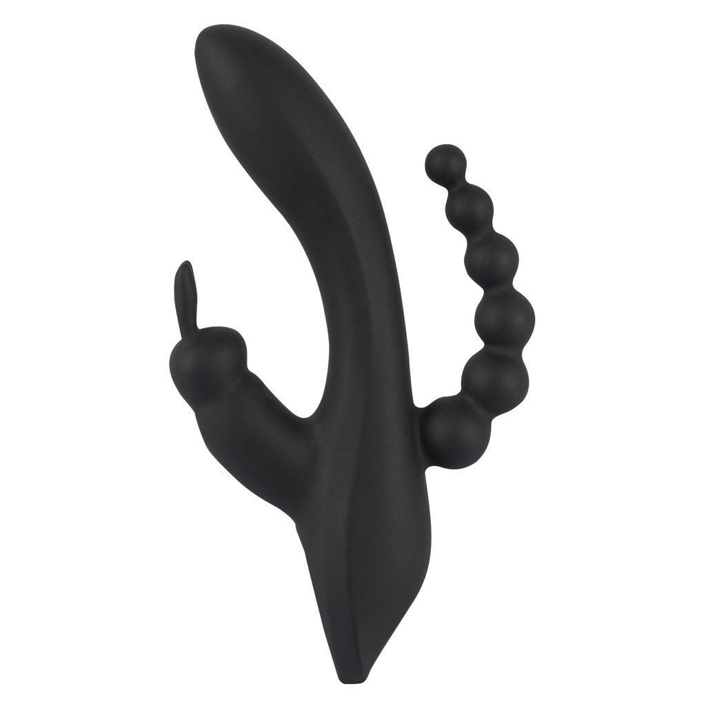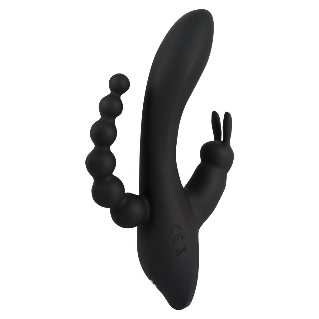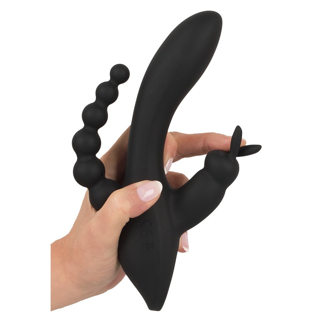 Vibrátor Triple G-spot Vás bude rozmazlovat trojnásobně; vibrující hlavní část stimuluje vaši vagínu a G bod, vás klitoris bude současně hýčkán malým vibrátorem ve tvaru králíčka 🐰. Dokonalé anální stimulace vám zajistí anální řetěz se šesti kuličkami různých velikostí. Hedvábně jemný a měkký silikonový materiál vás bude hýčkat, zatímco vibrace můžete pohodlně ovládat v 10ti různých režimech pouhým stiskem tlačítka – hlavní vibrátor vibruje samostatně v 7 režimech a stimulátor na klitoris ve 3 režimech. Užívat si stimulace můžete i ve vaně nebo ve sprše, protože tento trojitý vibrátor je vodotěsný.