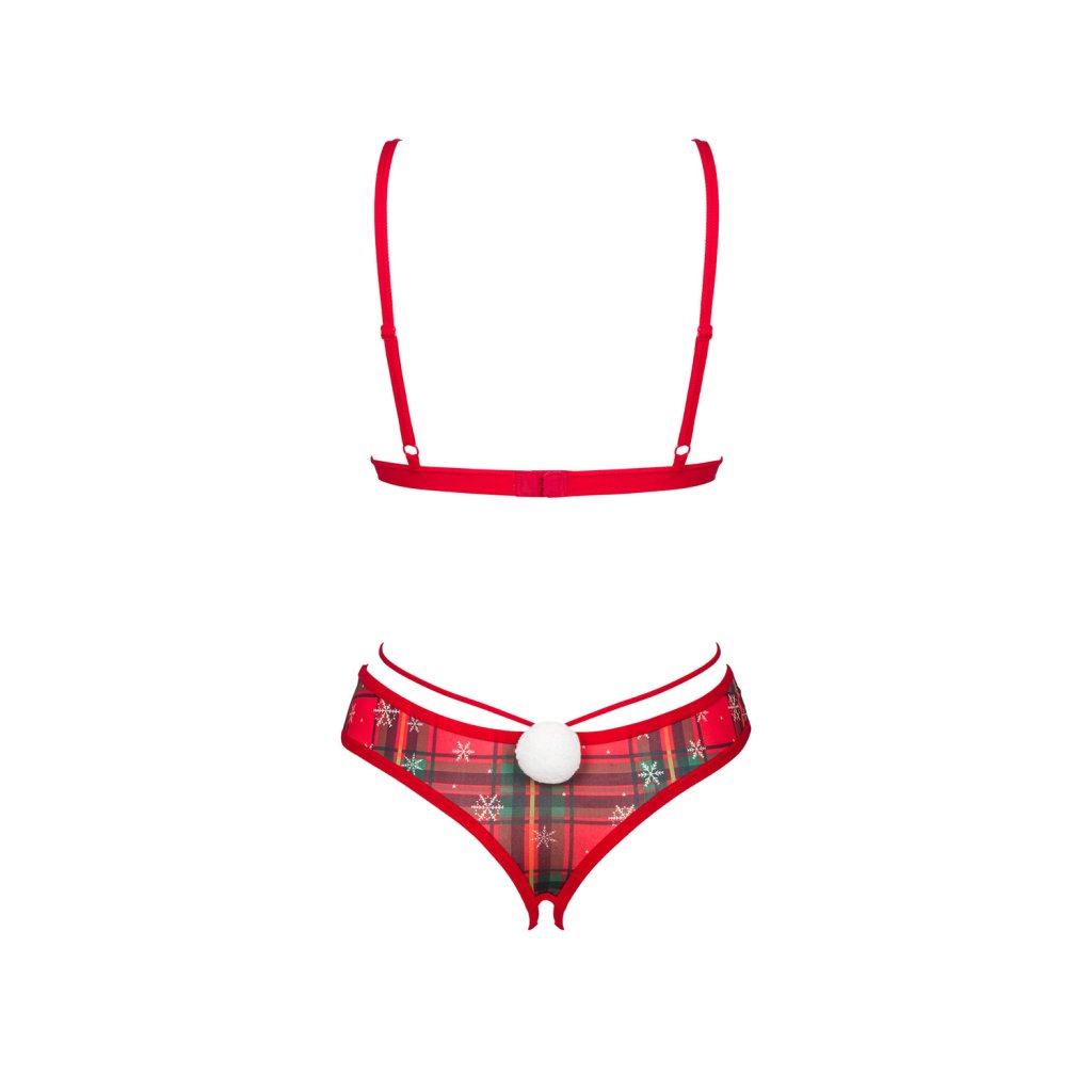 Překvapte svého partnera tímto hravým, ale zároveň elegantním kompletem. Vánoční podprsenka a kalhotky s otvorem Merrilo dokonalé padnou díky vícestupňovému zapínání a nastavitelným ramínkům. Svůdné proužky a pompon zaručeně zaujmou, zatímco lesklý přívěsek dodá na eleganci.