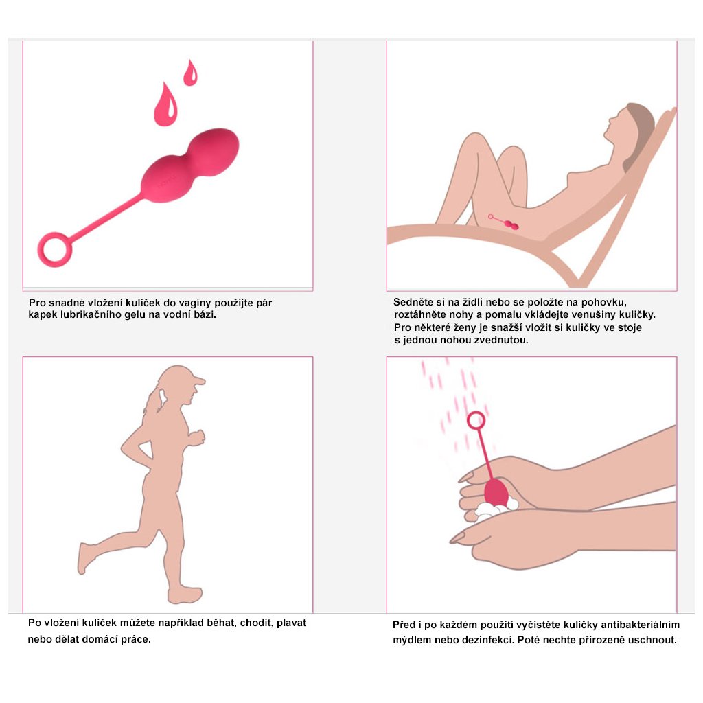 Venušiny kuličky byste měli mít zavedené např. při chůzi, běhu, plavání, tanci, domácích pracích….nikoliv při ležení nebo sezení. Díky těmto činnostem se budou vnitřní kovové kuličky uvnitř těla pohybovat a díky tomu dojde k posilování pánevních svalů.