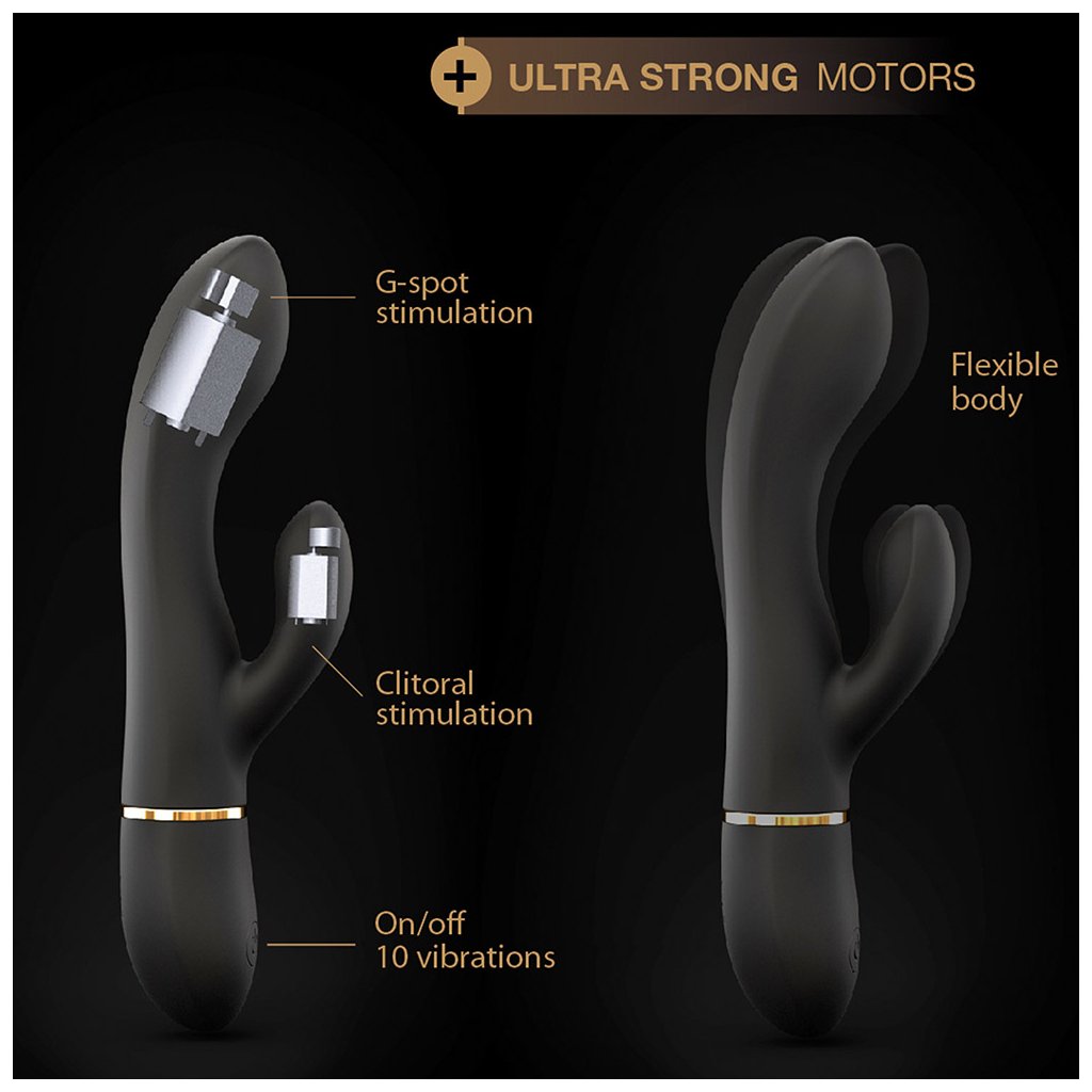 Flexibilní silikonový vibrátor se dvěma ultra silnými a tichými motorky a zakřivenou vyboulenou špičkou pro optimální stimulaci G bodu. Menší vibrátor (také velmi ohebný) bude stimulovat váš klitoris.